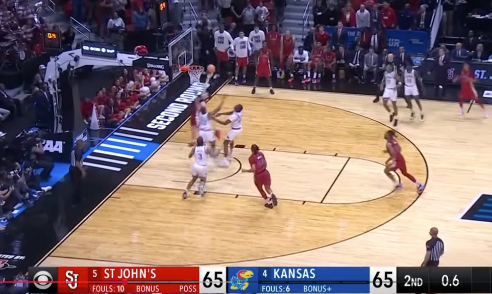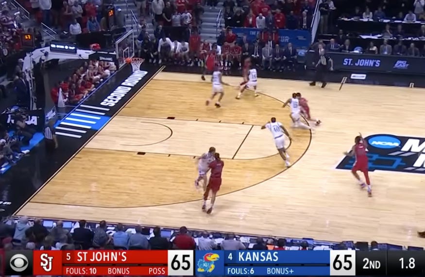 And the two Kansas defenders took the bait, leaving the paint and the path to the bucket wide open. If you’re playing percentages, you just gave St. John’s the highest percentage shot in basketball. Don’t turn your back on the ball. Protect your house (the paint) at all costs. Make the PG kick it out because there should be no clear path.